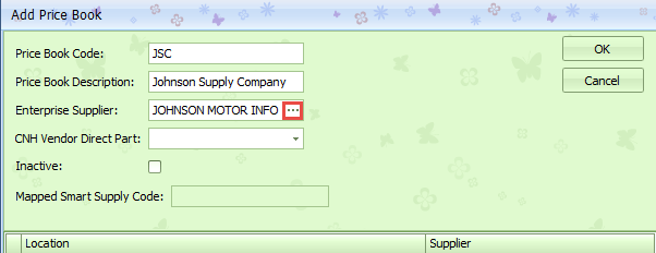 Add a new Code, Description, and Enterprise Supplier in the fields in the top half of the Add Price Book pop-up. The Enterprise Supplier will be chosen from a pop-up that will allow you to search for and select the Supplier that you will purchase the parts from. Click OK to add the new Price Book to the list.