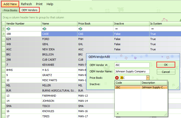 Navigate to the OEM Vendors tab. Click Add New at the top of this tab to get the OEMVendorAdd pop-up. Enter the new Vendor# and name. Select the pricebook you just created in the drop-down and click OK.