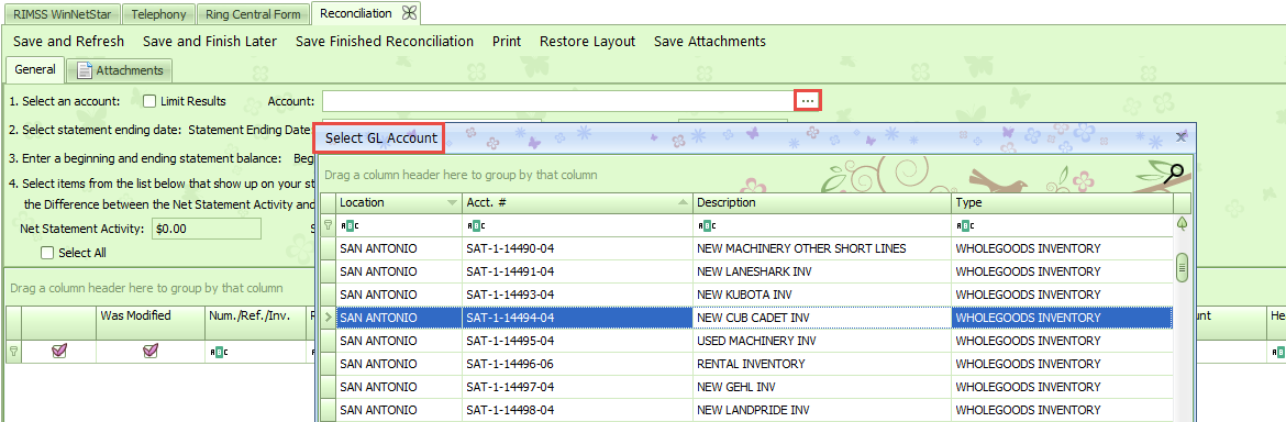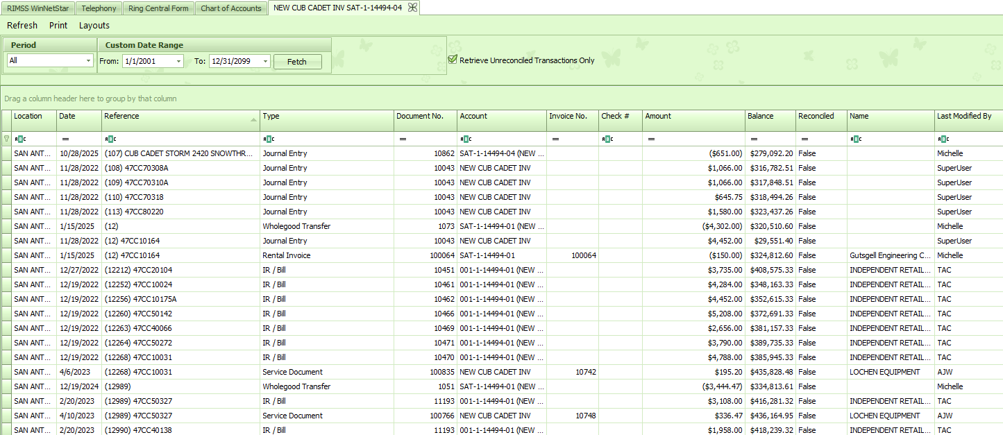 In our example, we will be reconciling a Wholegoods Inventory account. This is a similar process to reconciling Floor Plan and Contracts in Transit where the entries are referenced and can be reviewed by each reference (Wholegood or Supplier) posted.
