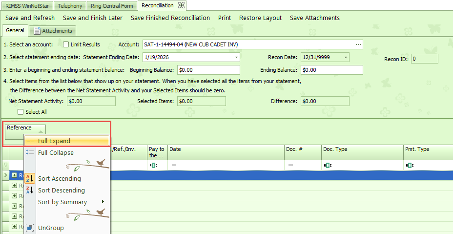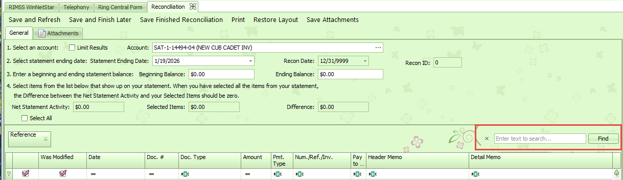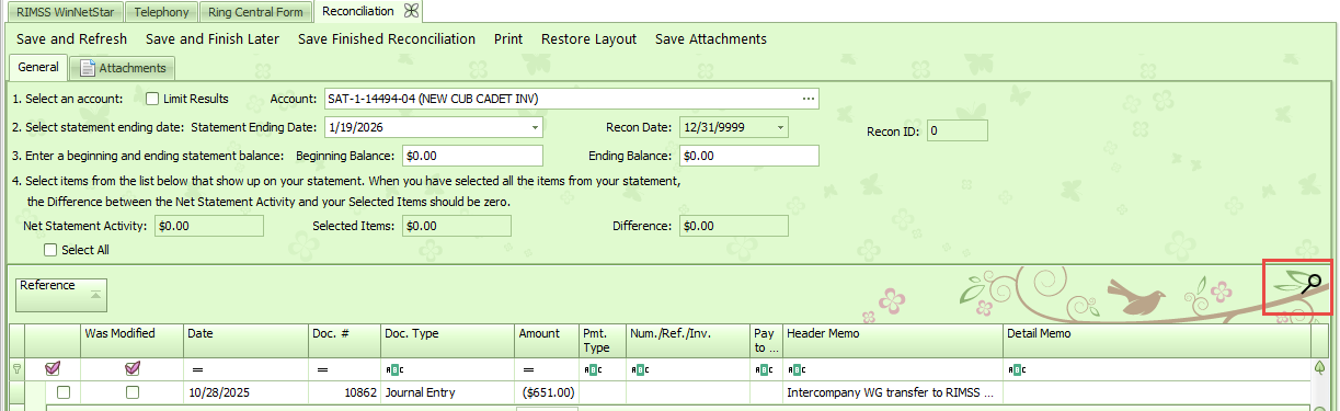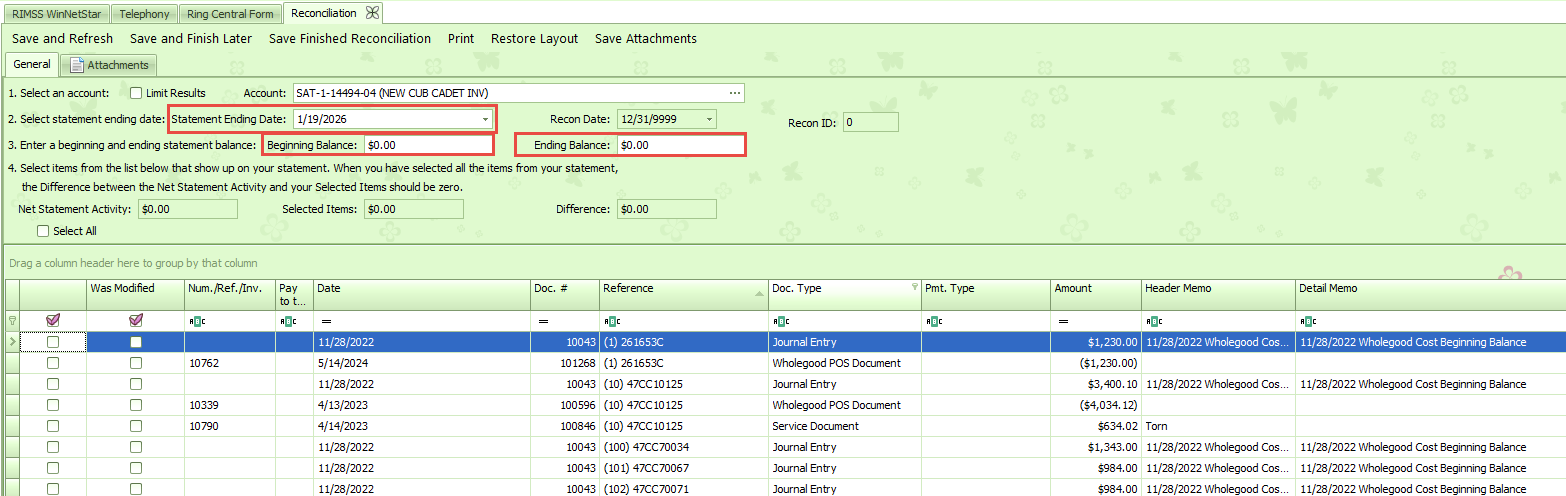 Once the account is populated, all unreconciled transactions will populate in the grid. You have the option to update the ending date for the reconciliation. The Beginning Balance and Ending Balance should be left at $0.00.