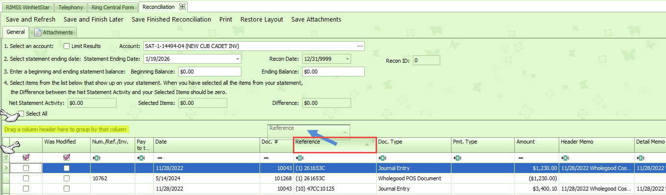 To group transactions by the reference field, locate the Reference column in the grid, click and hold on the header box to drag the box to the grouping area.