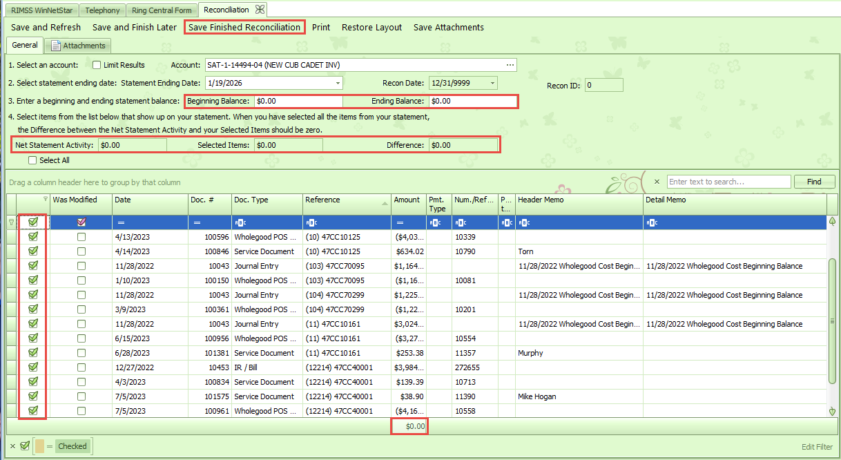 After selecting all transactions to be included in the reconciliation, the amounts that are calculated in the header information should all still subtotal to $0.00. Click on Save Finished Reconciliation to finalize and implement the Reconciliation. In my example below, I filtered the grid to only show line items selected to be included in the Reconciliation. This also allows me to verify the Amount of the selected items totals to $0.00.