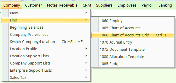 Company > Find > Chart of Accounts Grid