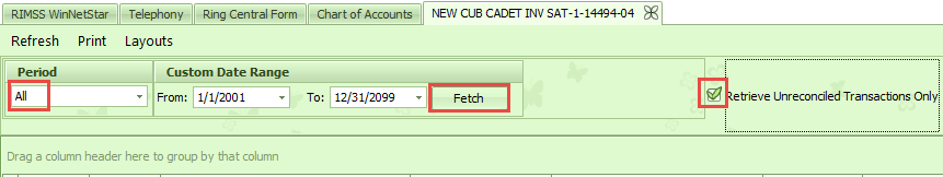 Double click on the account that was Reconciled to open the report. Set the Date Range to ALL. Select the box for Retrieve Uncreconciled Transactions Only and click Fetch.