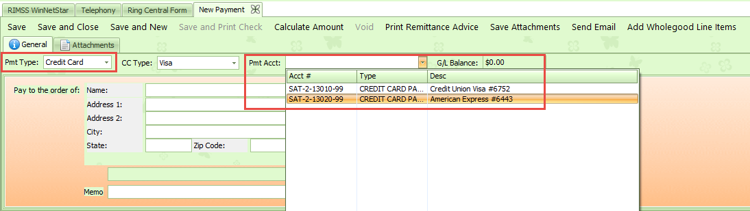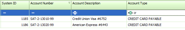 Accounts of Type Credit Card Payable function similarly to accounts of Type Bank. In the same way you can create as many different Bank accounts in RIMSS, you can create Credit Card Payable accounts in RIMSS. It is recommended that you create a separate G/L account for each credit card account that you want to track and pay separately.