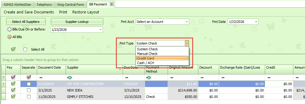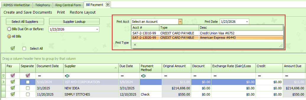 Once your accounts have been created, you will be able to use them on Payment Documents, Pay Bills, and Pay Supplier Statements to create the payment directly against the credit card account in RIMSS. To populate the Credit Card Payable accounts for payments, choose the Payment Type of Credit Card at the top of the document that you are working in. After selection, instead of Bank Accounts, the Credit Card Payable accounts will become available for selection.