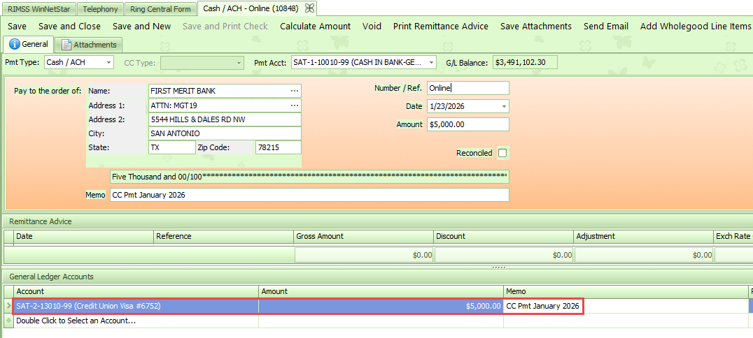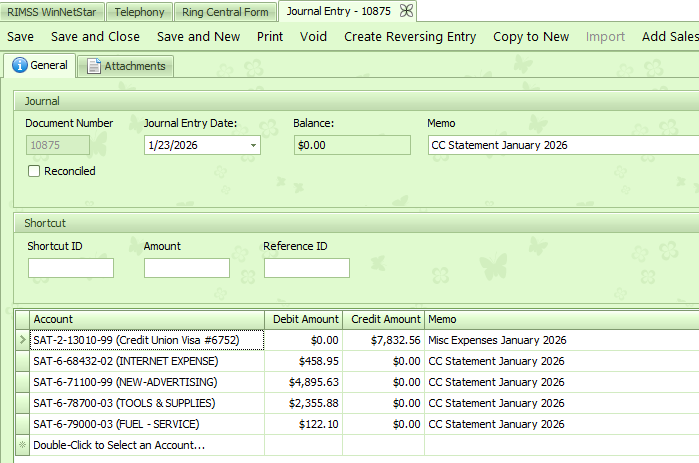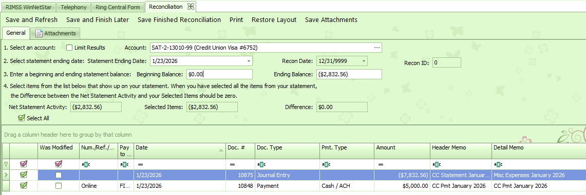 Once all purchases and payments are posted, you can reconcile the credit card account against the statement through the standard reconciliation process in RIMSS.
