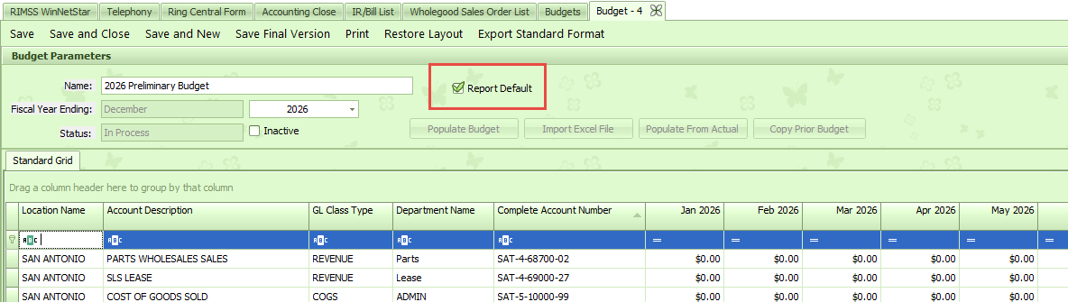 Select the budget from the list that you wish to incorporate into your reports and double-click to open. Select the option at the top of the Budget for Report Default. Click to Save the change after selecting the option. The default report is used in Dashboard Report analysis.