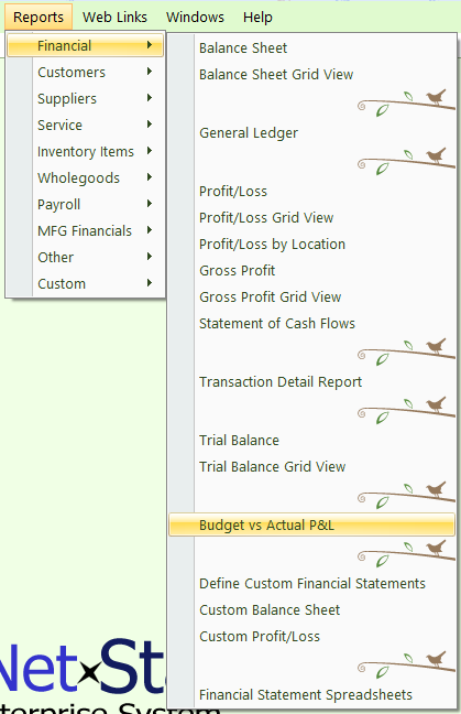 To access the Budget Vs Actual P&L, navigate to: Reports > Financial > Budget Vs Actual P&L