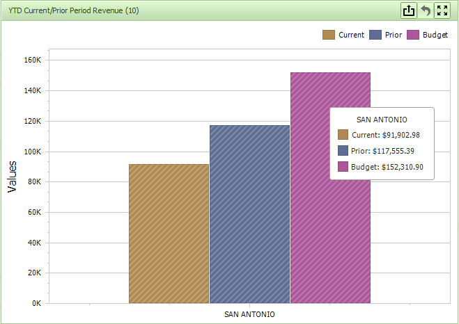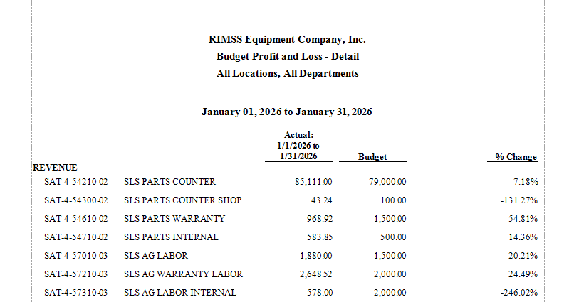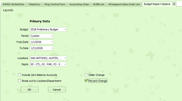 In this report, you have the option to select any active budget in the system from a drop-down. You will want to set the Period/Date Range, included Locations and Departments, and options for the comparison. Click OK to generate the report.