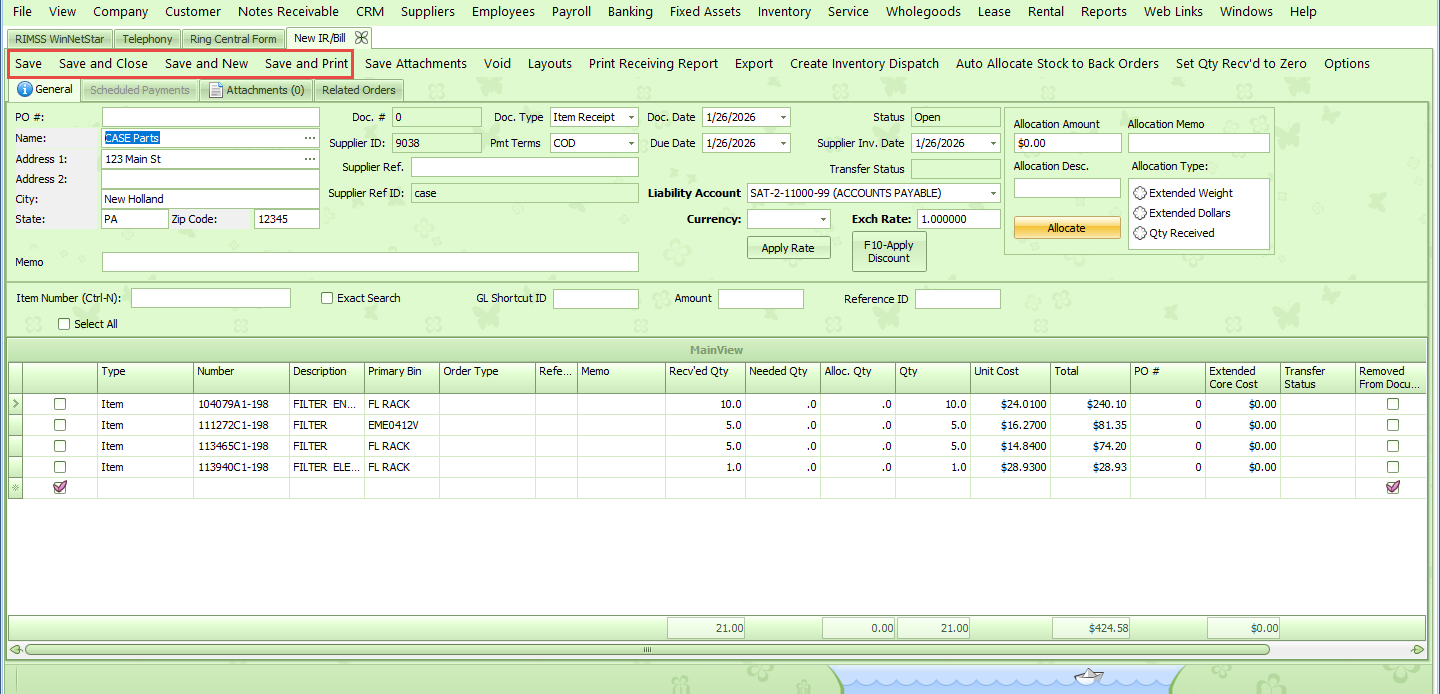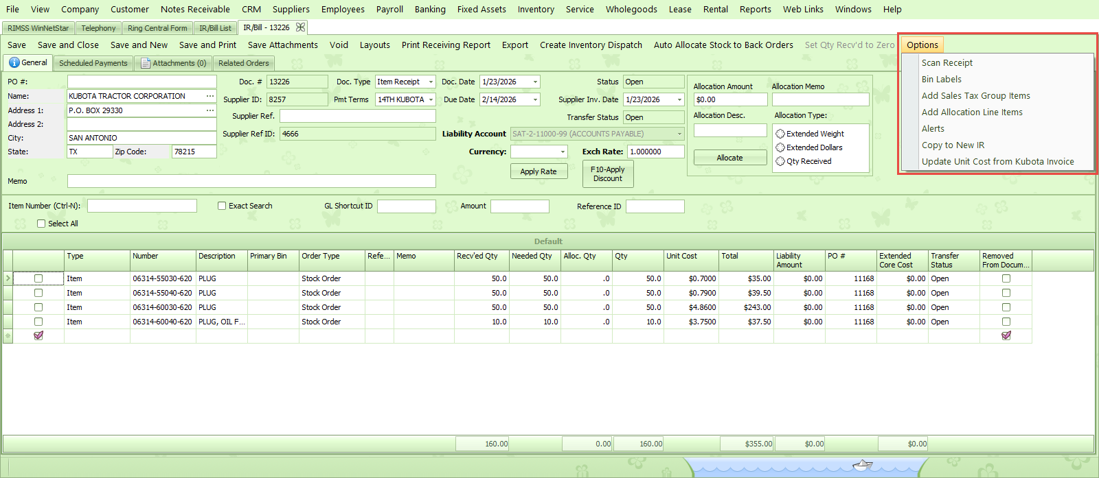 The Scan Receipt feature allows you to use a bar code scanner to receive parts directly on the IR/Bill. To use this feature, either receive a Purchase Order or Create a new blank IR/Bill. Prior to saving, click on the Scan Receipt feature within the Options.