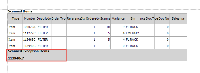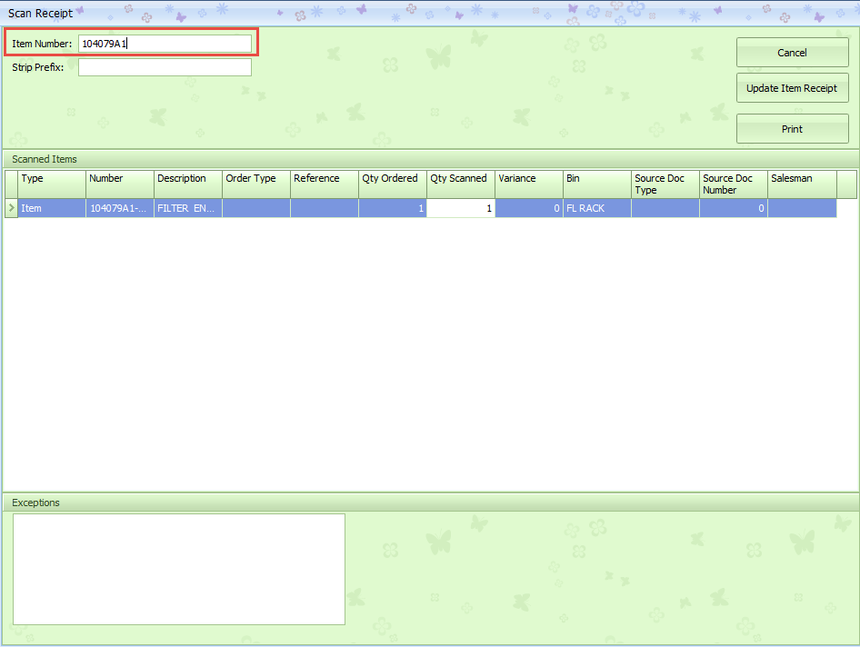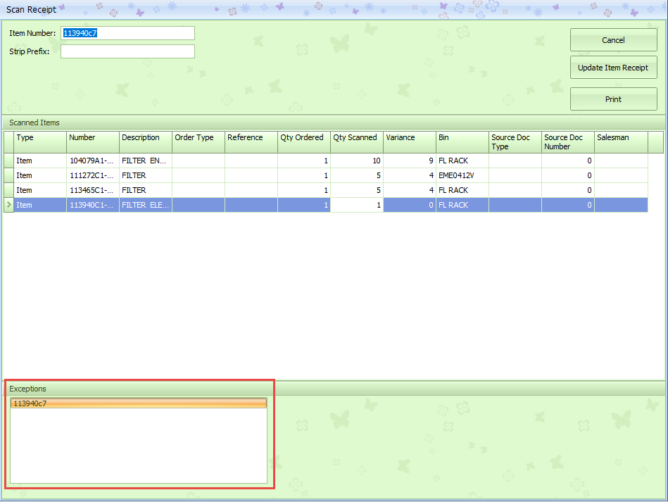 Any part numbers that are not found in your database will be listed in the Exceptions area. These parts will need to be reviewed to determine if you have them set up under a different part number or if you will need to add them to your database. You will need to add the exceptions to the IR/Bill manually after completing the Scan operation.