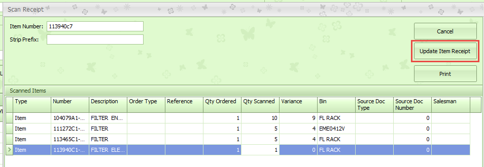 Click on the option to Update Item Receipt once you are finished will all scanning and have saved your exception report. Once you click this option, you cannot come back to continue scanning. This option is only available at the initial opening of the Item Receipt.