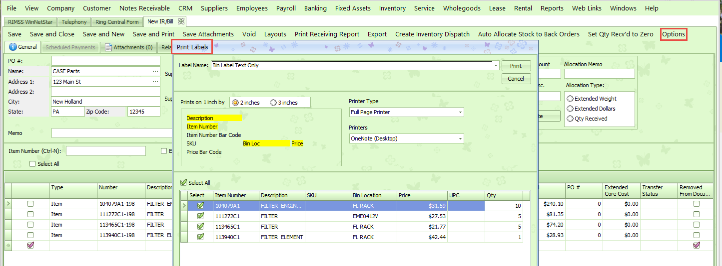 The Bin Labels feature will allow you to print the RIMSS Bin Labels for the parts that are on the Item Receipt. To use this feature, first create the IR/Bill with all parts to be received. Select Options, then Bin Labels from the list. You will see a pop-up that lists all parts on the IR/Bill.