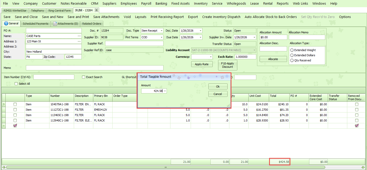 You will see a popup on the IR/Bill to enter the total taxable amount. This will be the amount the system will use to calculate the appropriate Sales Tax for each line item. In my example below, the taxable line items total $424.58, therefore I will enter the $424.58 amount to calculate the tax amount. Click OK after entering the amount.