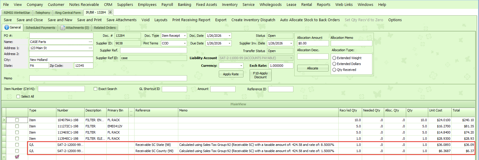The system will calculate the sales tax for the amount entered and populate 1 line item for each taxing jurisdiction set up in the tax group with the tax amount tied to each jurisdiction. A memo will populate to provide the details of the information provided when the lines were added. You have full edit and delete capability on the lines that are populated if you want to change the amount, memo, or account.