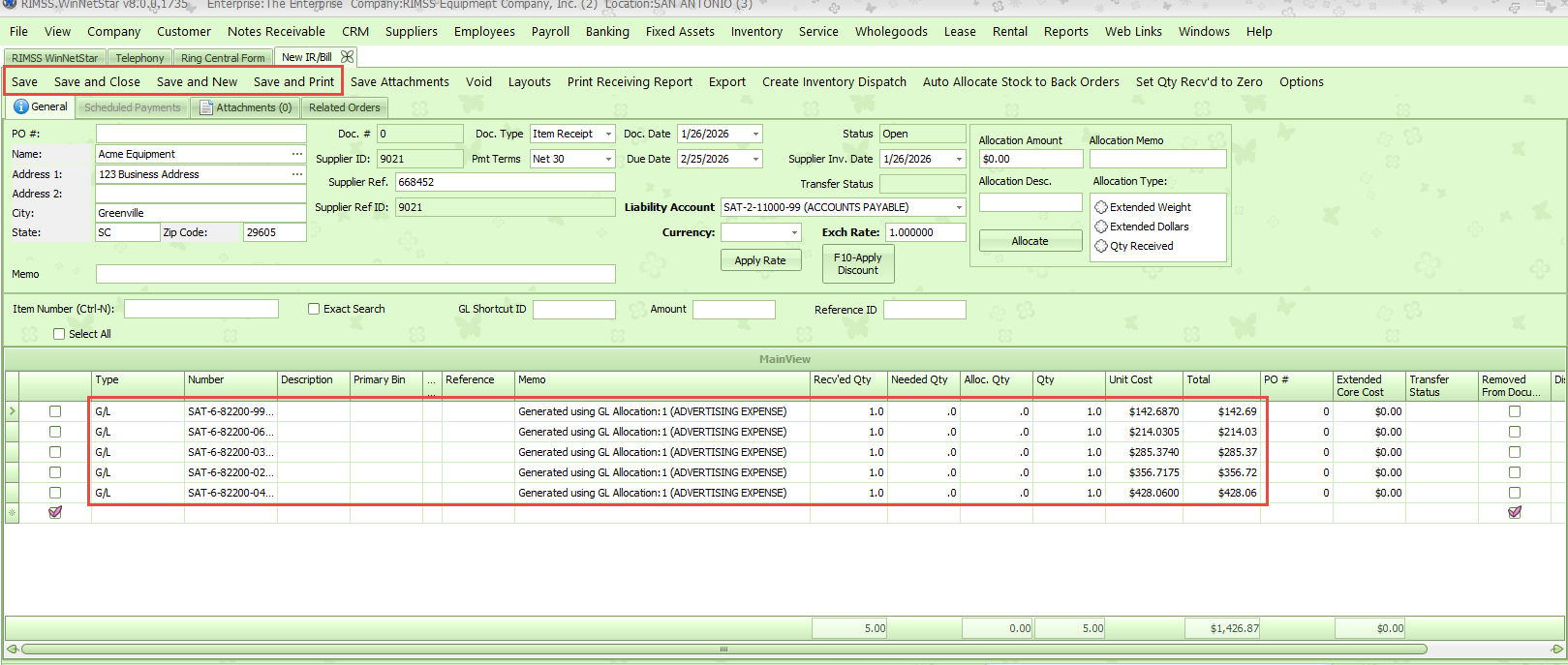 The system will apply the allocation template and populate the allocated line items according to the percentages and accounts that are configured. A memo will populate showing the Allocation Template chosen. RIMSS will automatically round the amounts to ensure they match the total amount entered in the box. All detail is able to be fully edited or deleted after populated on the IR/Bill. You may add allocation line items multiple times to a single IR/Bill. Be sure to click one of the Save Options after you have finished entering all information.