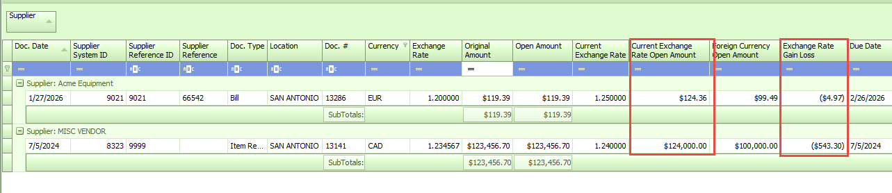 From the report that you exported with the Current Exchange calculations, enter the data from the Exchange Rate Gain Loss column into the Pay Bills grid in the Exchange Rate (Gain)/Loss column. Ensure you enter this data in the correct Invoice row. After entering, the Adjusted Amount Due in Pay Bills will match the Current Exchange Rate Open Amount from the report.