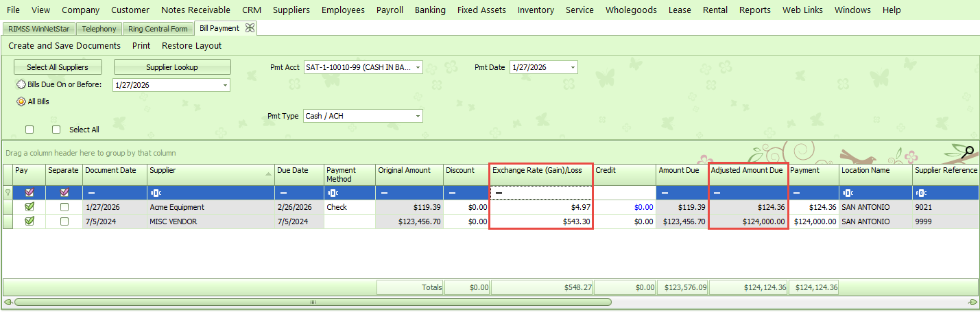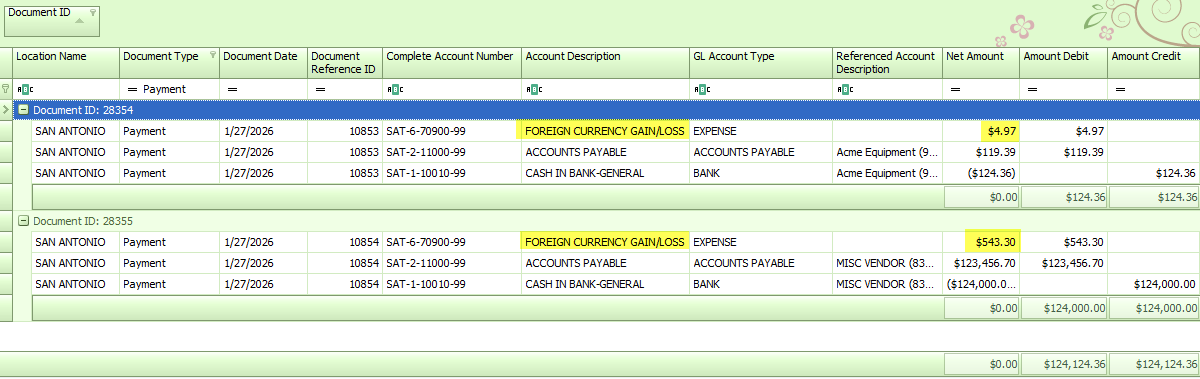 Once you create your payment documents, the amount of the Exchange Rate Gain/Loss will be posted to the default Foreign Currency Gain/Loss account that you assigned in the Location Profile. If you do not book an adjustment in pay bills, no amount will post to the account.
