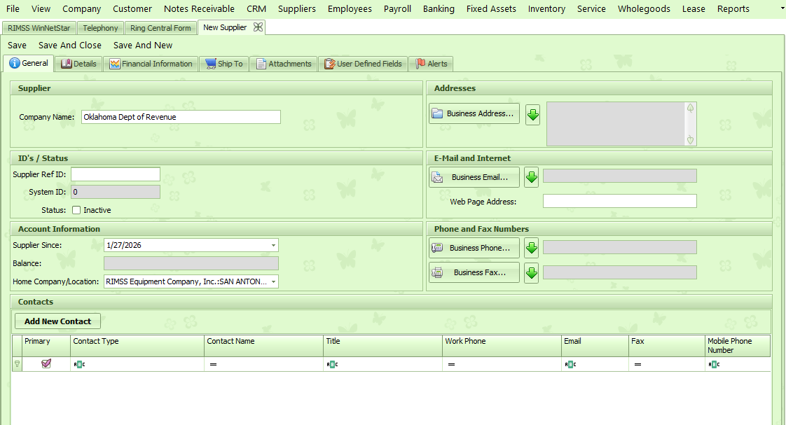 If you are required to register in a new state and file Sales Tax, you will need to create a new Sales Tax Supplier in RIMSS. To add the Supplier, navigate to: