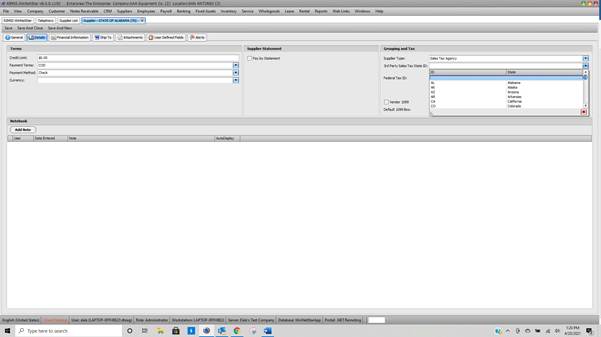 You will need to have a Supplier Master Record for each state set up with the Supplier Type of Sales Tax Agency. In addition, each of these master records should also be linked to the two-character state abbreviation used by TaxJar when providing the sales tax amounts and respective tax jurisdictions. This linking process is performed by navigating to the Details tab of the Supplier Master and first setting the Supplier Type to Sales Tax Agency. After selecting this supplier type a new drop down will appear allowing you to select the two-character state abbreviation as seen in the image below: