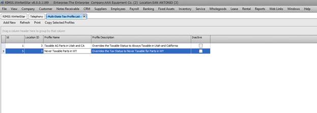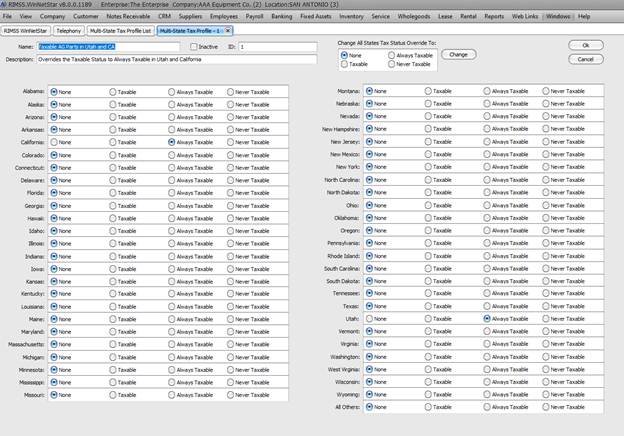 Similar to the Customer’s tax status by state, you also have the ability to set the tax status of the things you sell by state. Navigate to Company>Location Support List>Multi-State Tax Profiles to find the screen below.
