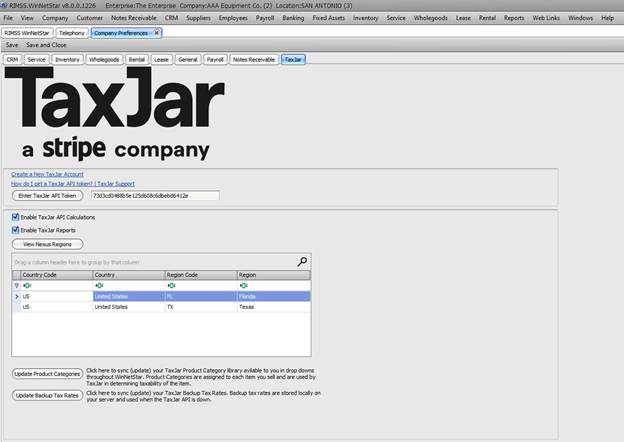 Within WinNetStar, we will navigate to Company>Company Preferences and click on the TaxJar tab. Once you have created an account, we will assist you in retrieving your TaxJar API Token.
