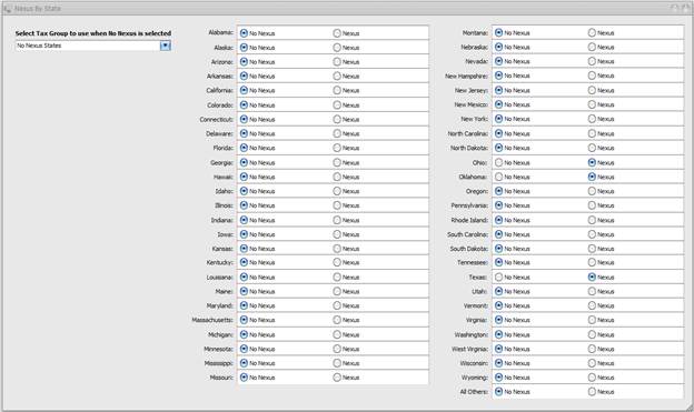 Navigate to Company>Sales Tax>Nexus by State to view the screen below. You will need to select the states in which you have Nexus. These selections affect the way sales tax logic applies sales tax to ship to sales. You will also need to use the drop down to select a Sales Tax Group for the system to use when you are shipping to a state in which you have No Nexus. We recommend that you create a new Sales Tax Item named No Nexus States with a tax rate of zero and put this Item into a New Sales Tax Group named No Nexus States to use for this purpose.
