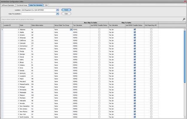 Each location within your company will have the option to use either RIMSS or TaxJar for its sales tax calculations on a state-by-state basis with options for Ship to Sales only, or both Ship to and Non-Ship to Sales (over-the-counter). In addition, if you choose to use TaxJar for the calculation, you have the option to use RIMSS in determining the Taxable Status of the transaction. The screen below is available to RIMSS personnel only and will be configured with the options that you select.