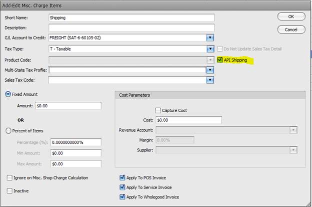 Shipping – taxability of shipping varies from state to state and the TaxJar API requires that we specifically identify the shipping charge on a document. This is facilitated by checking the API Shipping box on the miscellaneous charge that you wish to use as seen below. Only one miscellaneous charge can be selected and this must be done for each location.