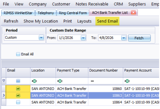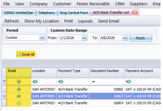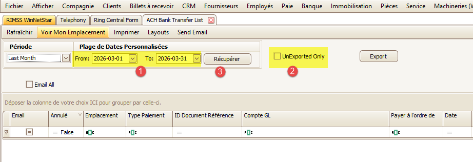 Dans la liste des virements bancaires ACH, définissez la plage de dates pour inclure les paiements que vous souhaitez inclure dans le lot d'email. Décochez l'option "UnExported Only" pour inclure les paiements exportés. Cliquez sur "Récupérer" pour obtenir la liste des paiements.